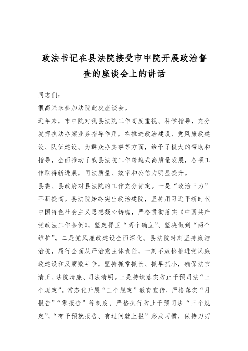 / 政法书记在县法院接受市中院开展政治督查的座谈会上的讲话稿