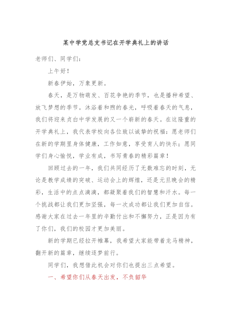 / 某中学党总支书记在开学典礼上的讲话稿