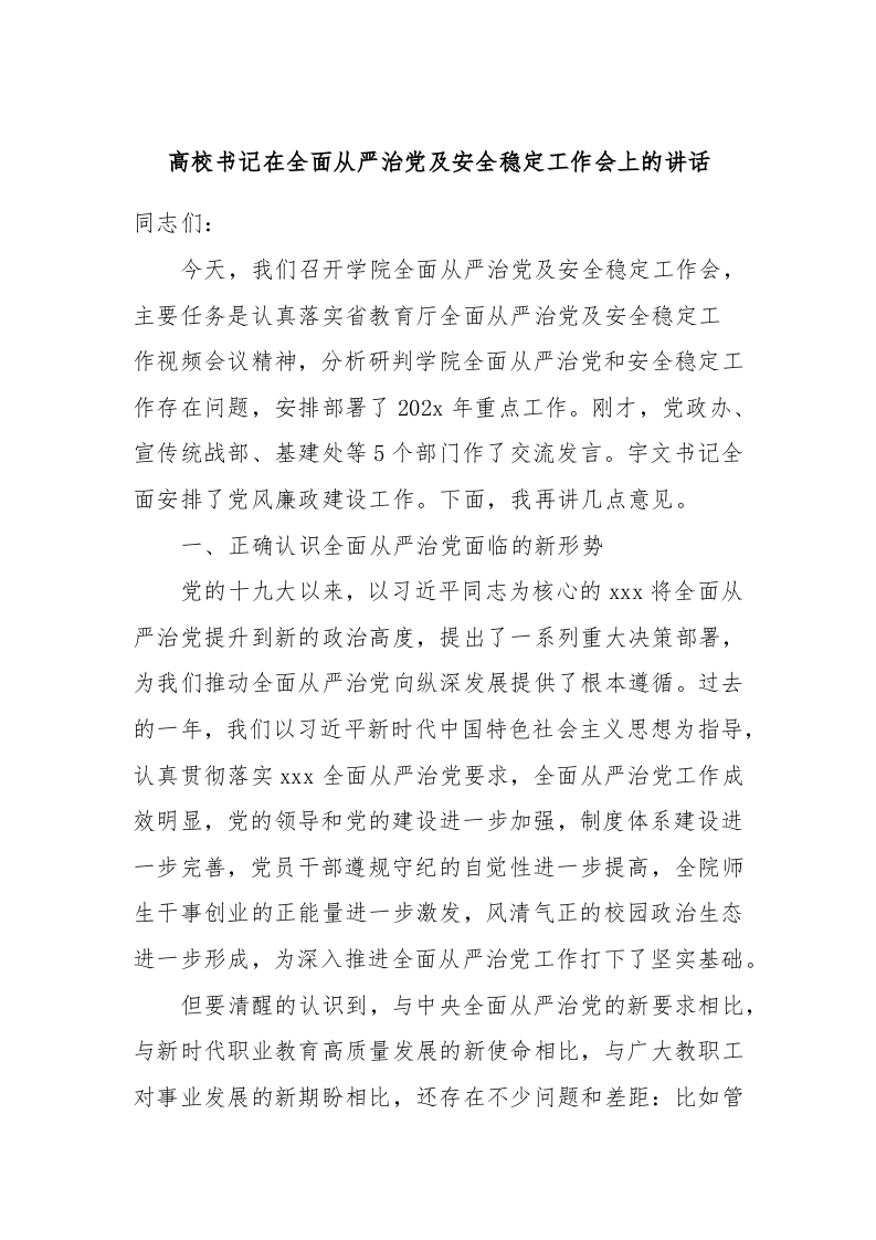/ 高校书记在全面从严治党及安全稳定工作会上的讲话稿