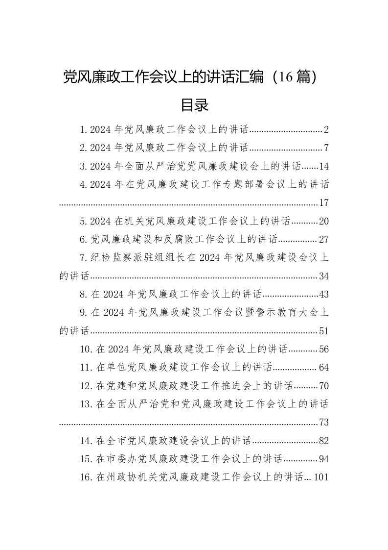 / 2024年党风廉政工作会议上的讲话稿汇编(16篇)