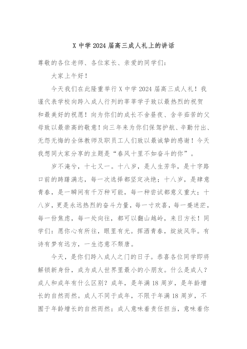 / X中学2024届高三成人礼上的讲话稿