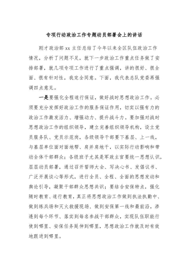 / 专项行动政治工作专题动员部署会上的讲话稿