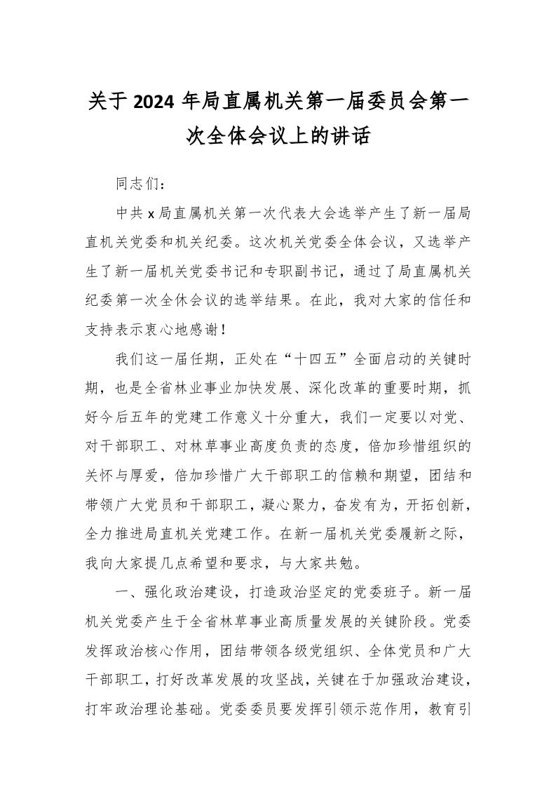 关于2024年局直属机关第一届委员会第一次全体会议上的讲话稿