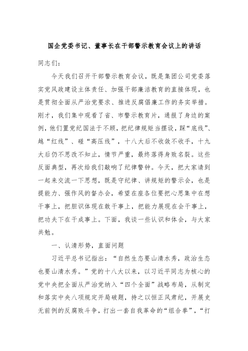 / 国企党委书记、董事长在干部警示教育会议上的讲话稿