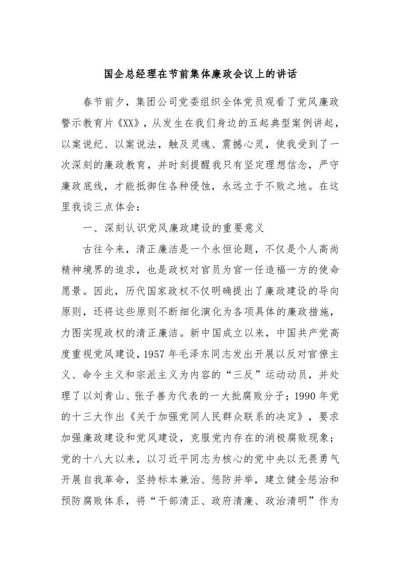 / 国企总经理在节前集体廉政会议上的讲话稿