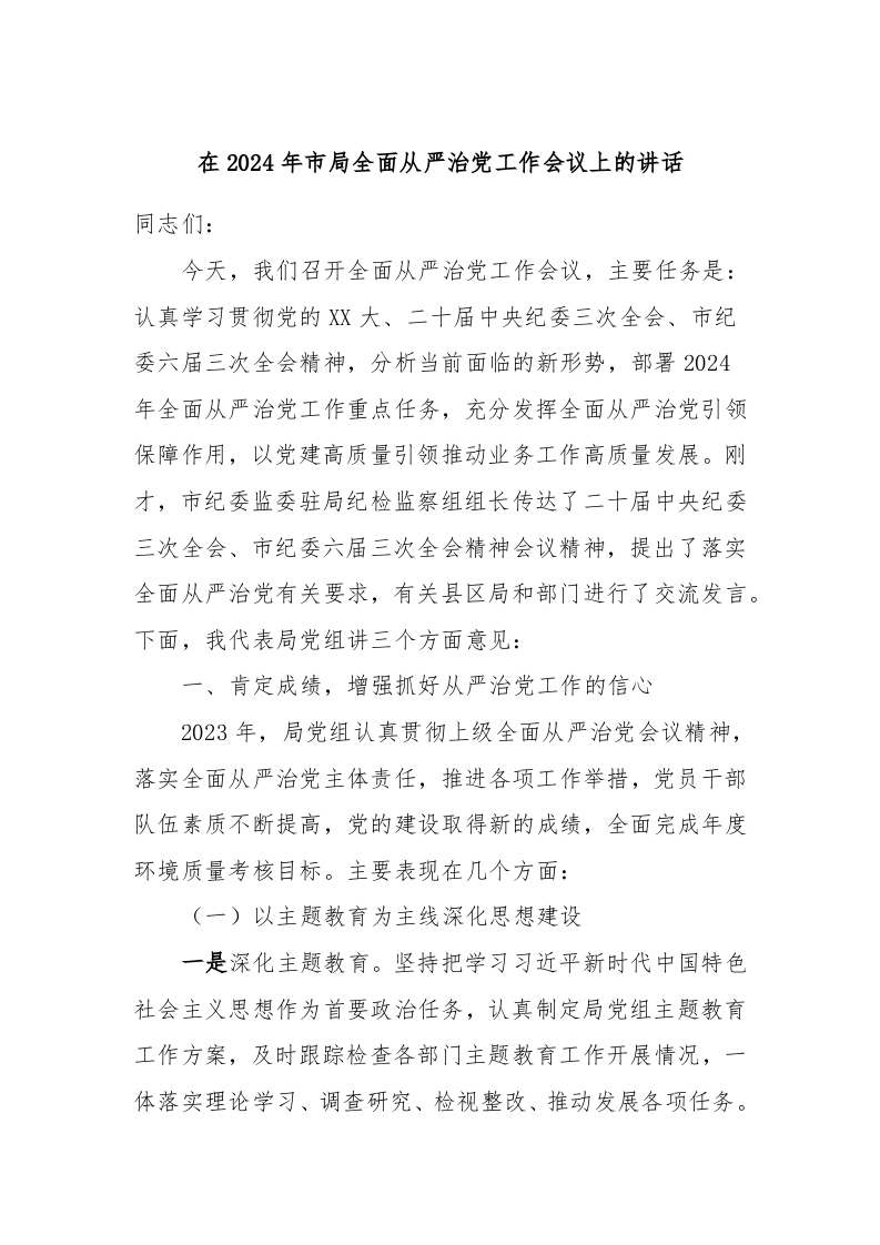 / 在2024年市局全面从严治党工作会议上的讲话稿