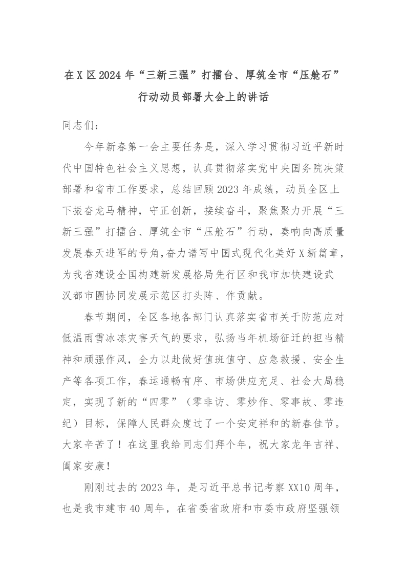 / 在X区2024年“三新三强”打擂台、厚筑全市“压舱石”行动动员部署大会上的讲话稿