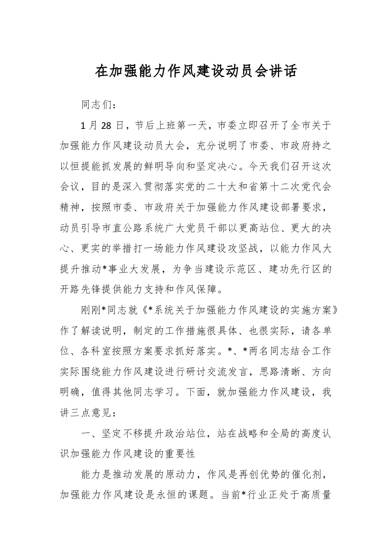 / 在加强能力作风建设动员会讲话稿