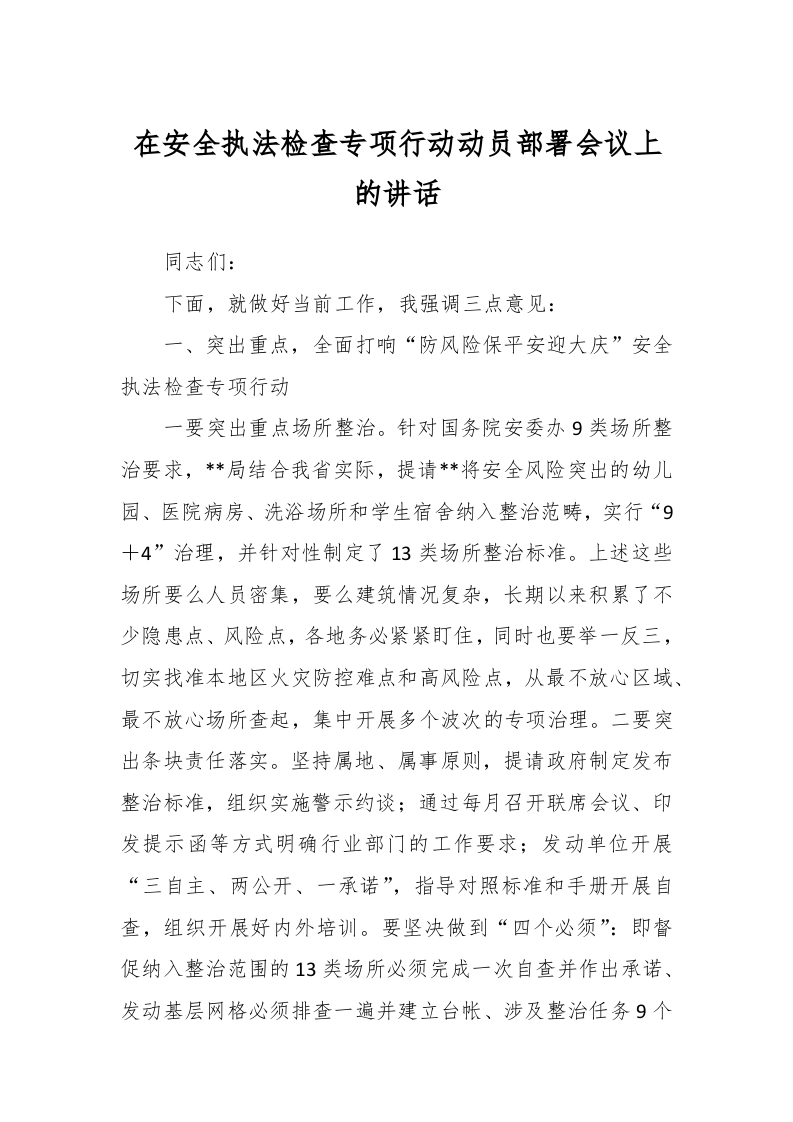 / 在安全执法检查专项行动动员部署会议上的讲话稿