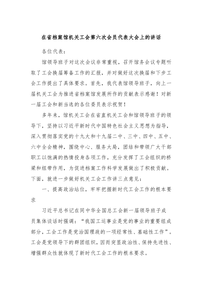 / 在省档案馆机关工会第六次会员代表大会上的讲话稿