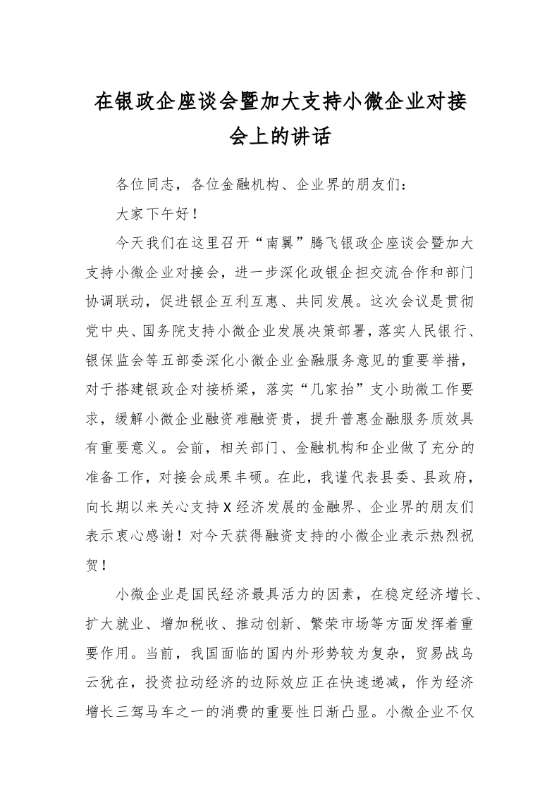 / 在银政企座谈会暨加大支持小微企业对接会上的讲话稿