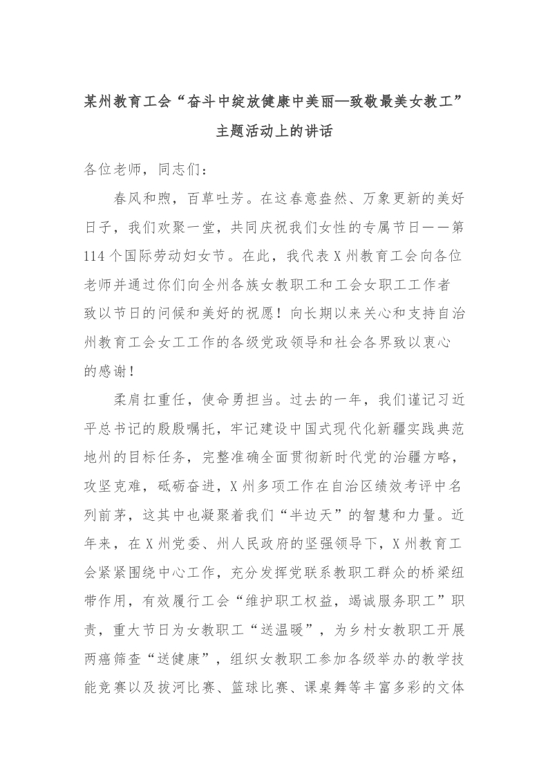 / 某州教育工会“奋斗中绽放健康中美丽—致敬最美女教工”主题活动上的讲话稿