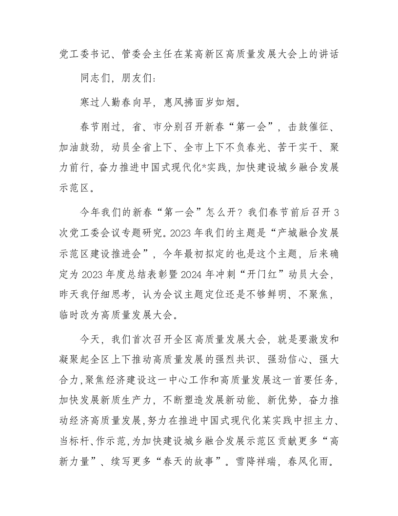 / 党工委书记、管委会主任在某高新区高质量发展大会上的讲话