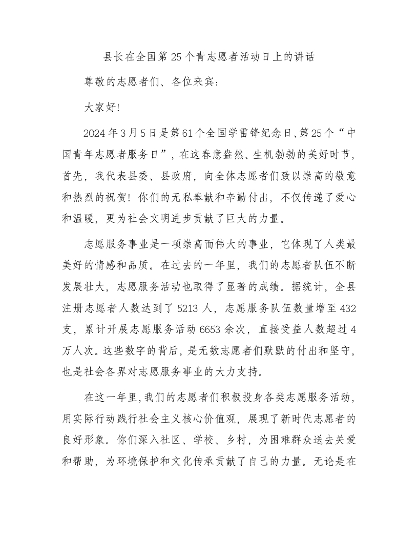 / 县长在全国第25个青志愿者活动日上的讲话