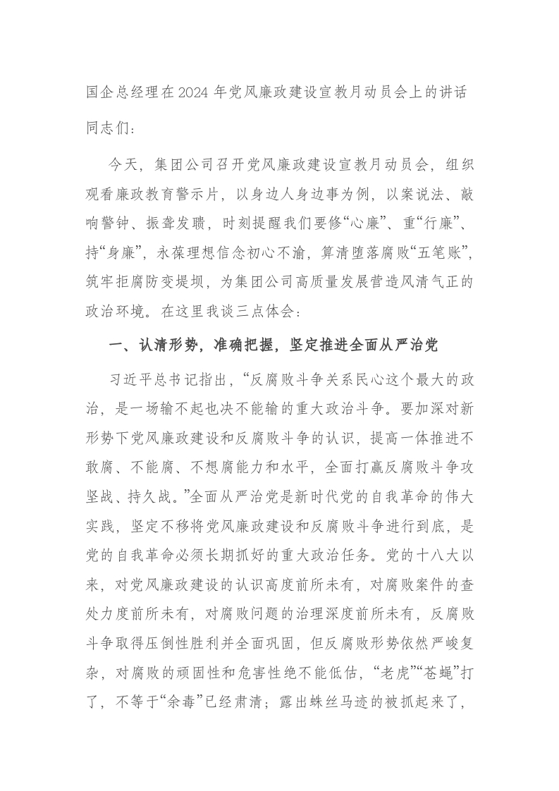/ 国企总经理在2024年党风廉政建设宣教月动员会上的讲话