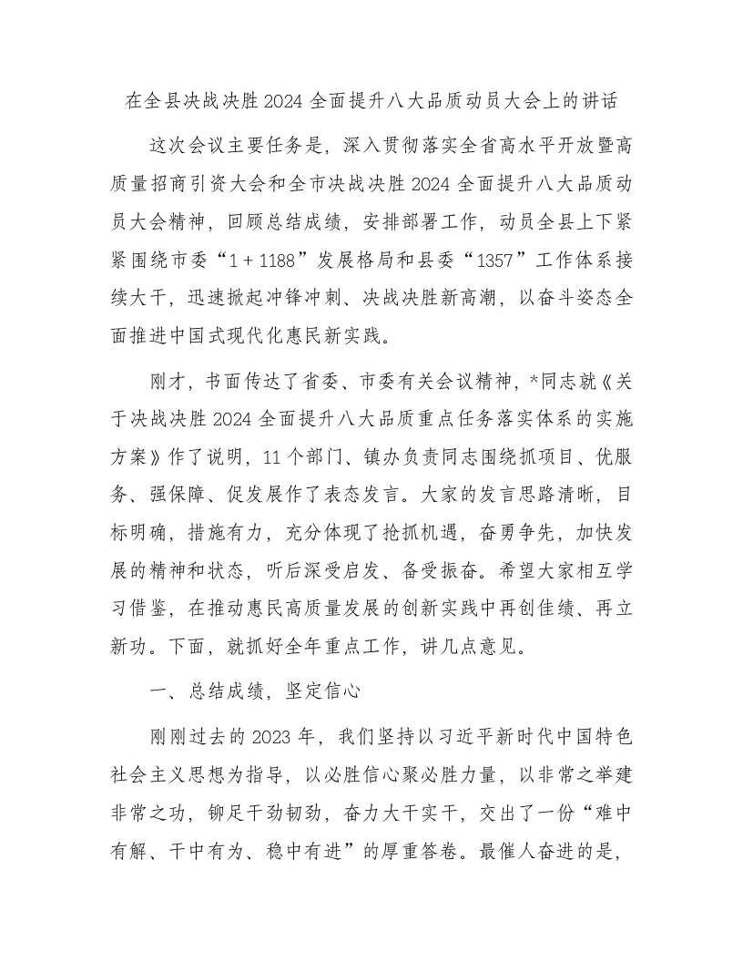 / 在全县决战决胜2024全面提升八大品质动员大会上的讲话