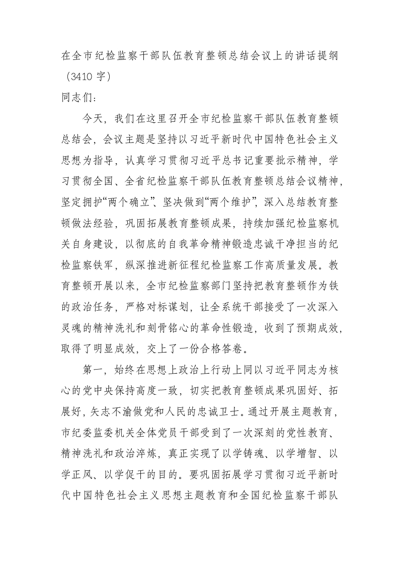 / 在全市纪检监察干部队伍教育整顿总结会议上的讲话提纲