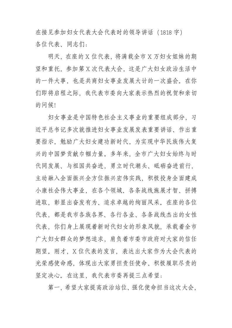 / 在接见参加妇女代表大会代表时的领导讲话