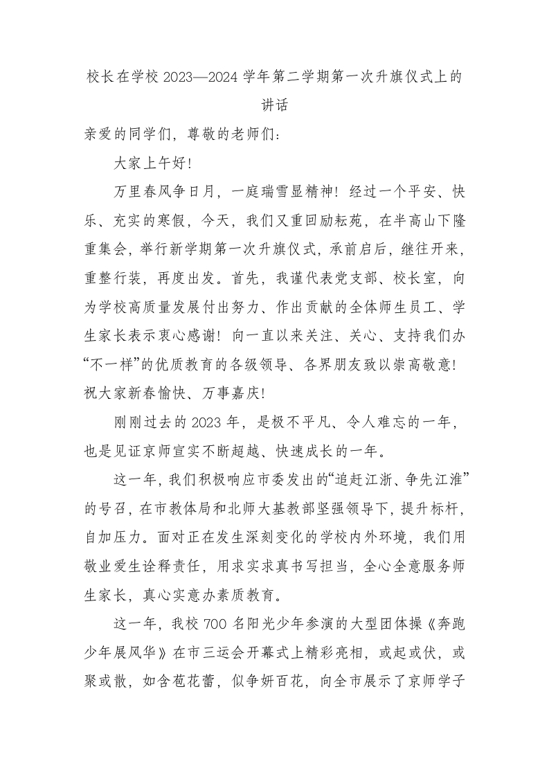 校长在学校2023—2024学年第二学期第一次升旗仪式上的讲话