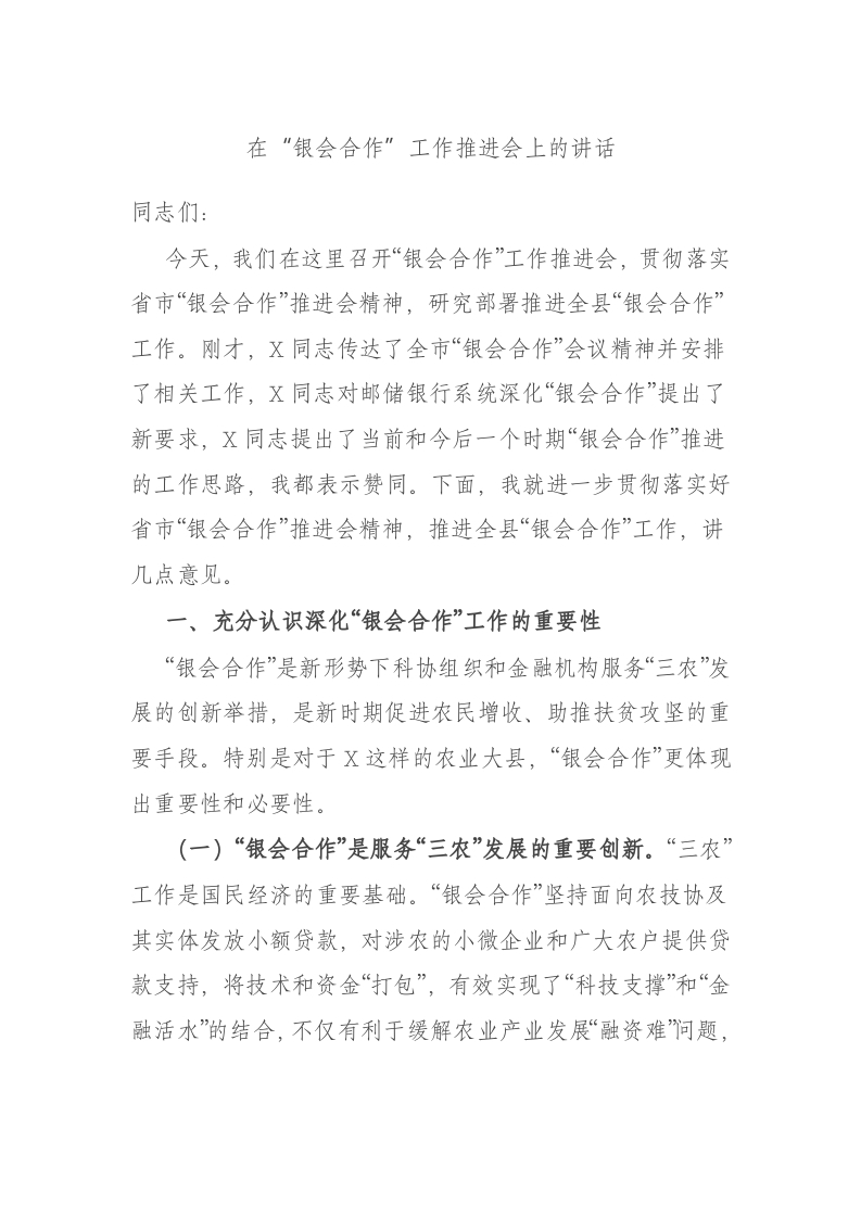 / 在“银会合作”工作推进会上的讲话