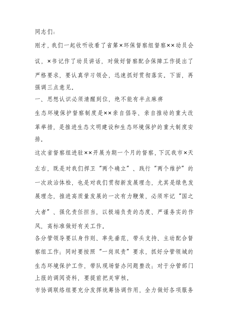 / 在生态环境保护督察工作动员会上的讲话