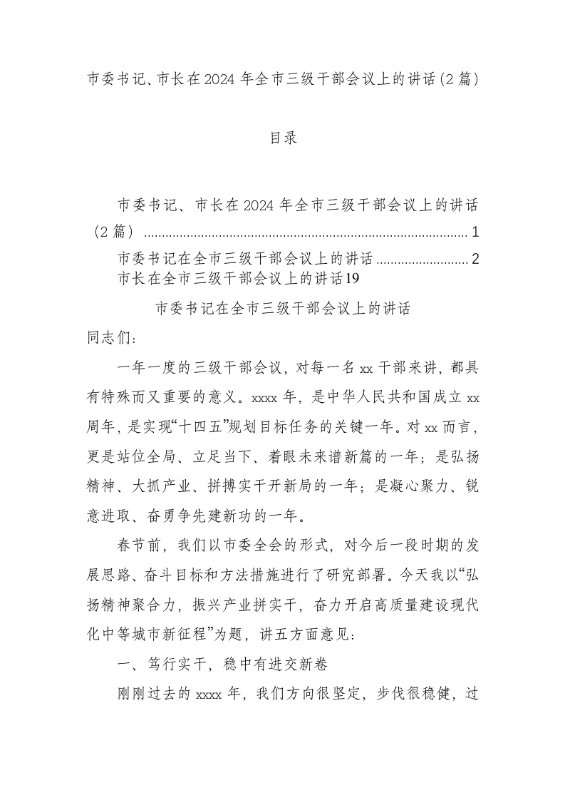 / 市委书记、市长在2024年全市三级干部会议上的讲话(2篇)