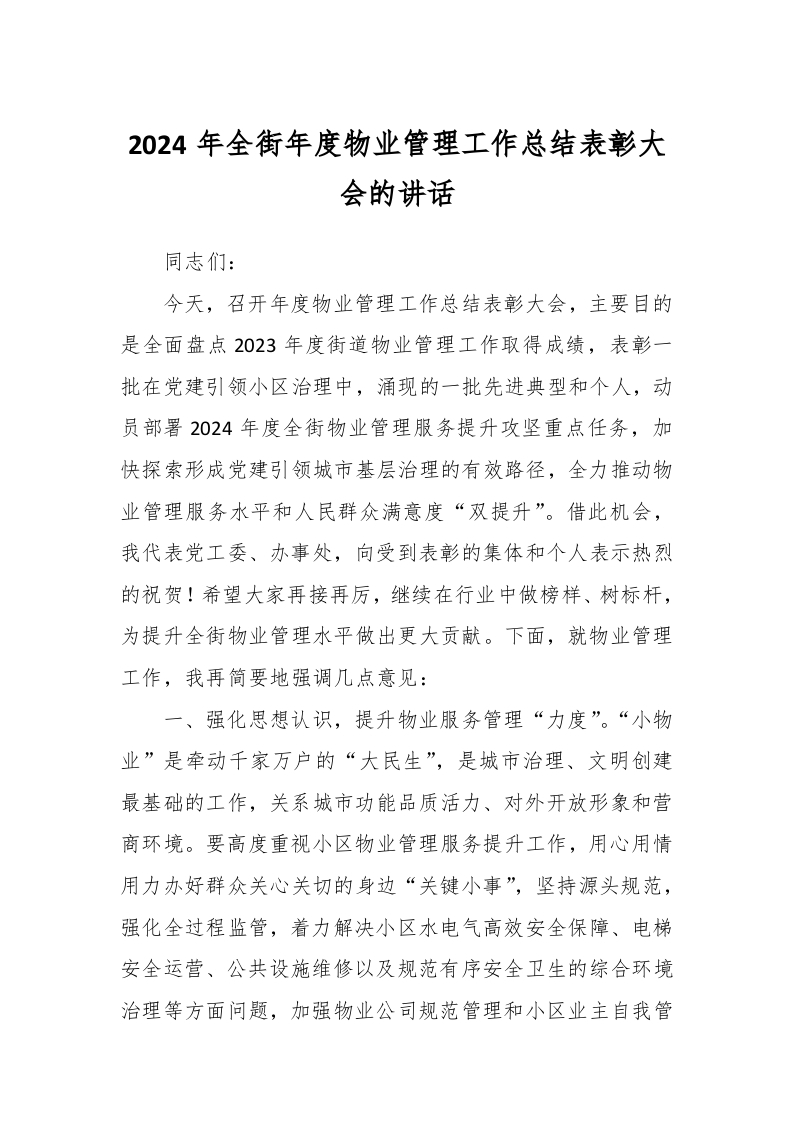 / 2024年全街年度物业管理工作总结表彰大会的讲话稿