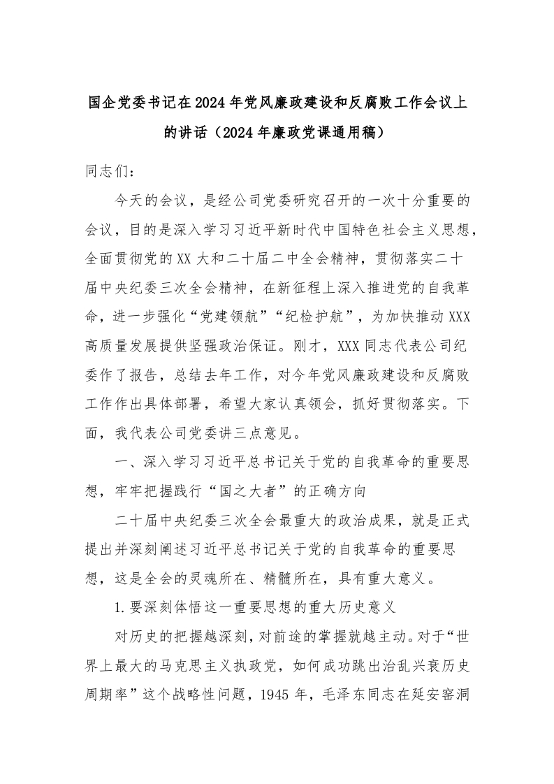 / 国企党委书记在2024年党风廉政建设和反腐败工作会议上的讲话稿(2024年廉政党课通用稿)