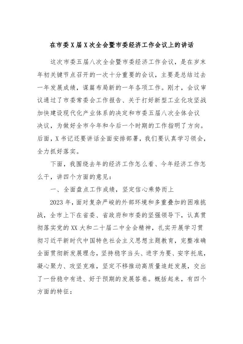 / 在市委X届X次全会暨市委经济工作会议上的讲话稿