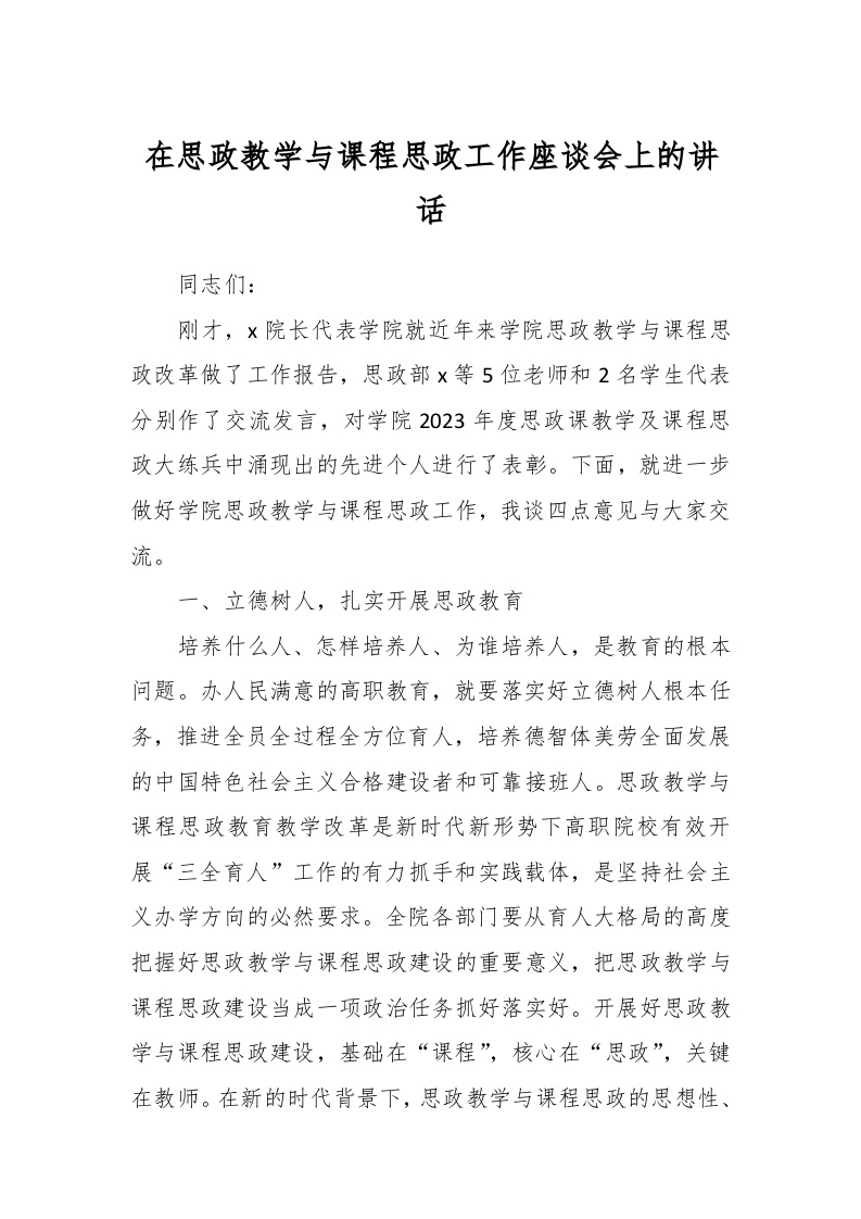 / 在思政教学与课程思政工作座谈会上的讲话稿
