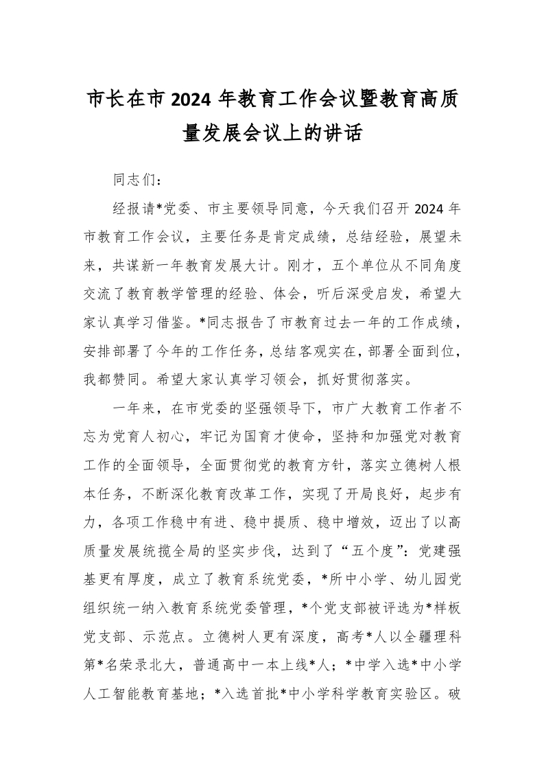 市长在市2024年教育工作会议暨教育高质量发展会议上的讲话稿