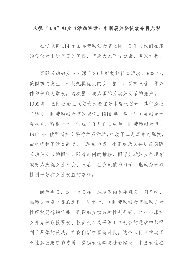 庆祝“38”妇女节活动讲话稿:巾帼展英姿绽放夺目光彩