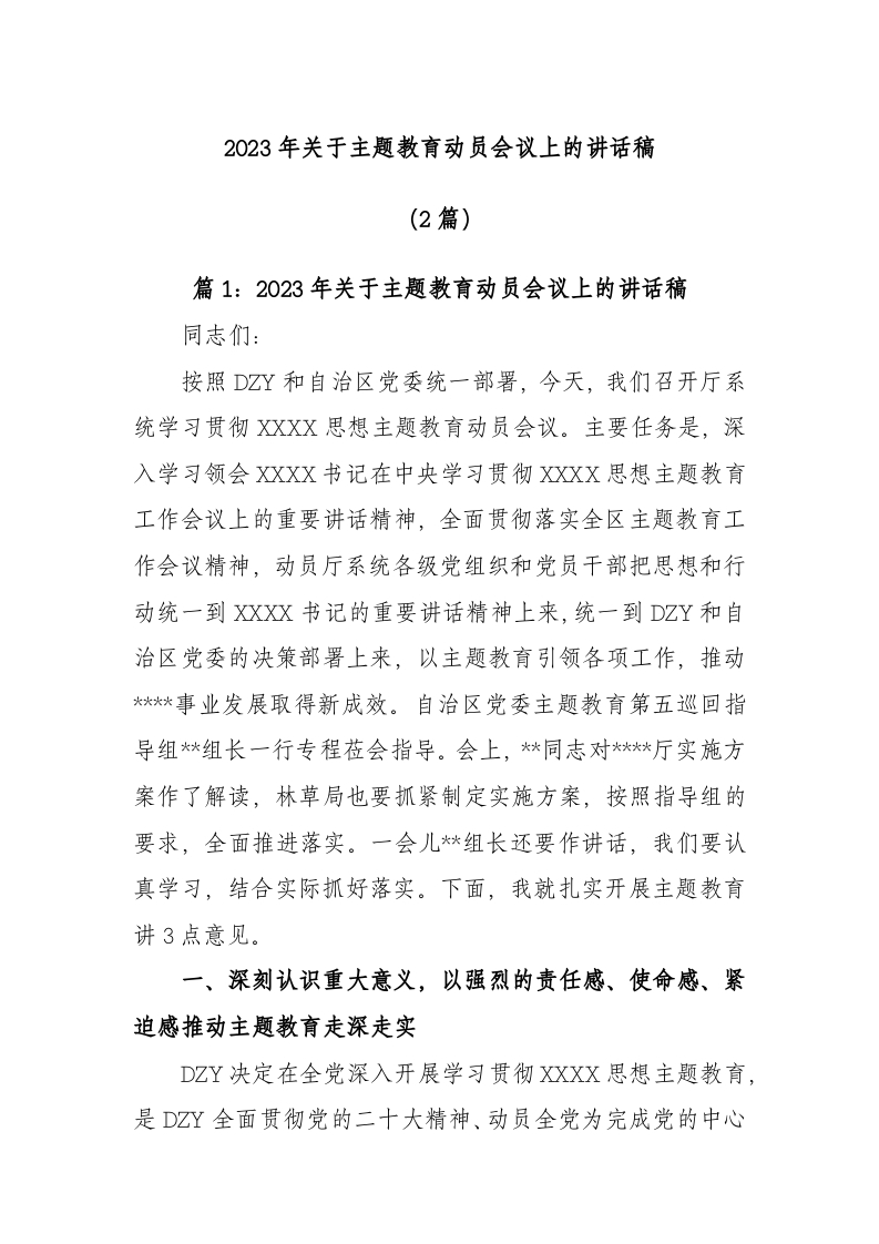 (2篇)2023年主题教育动员会议上的讲话稿