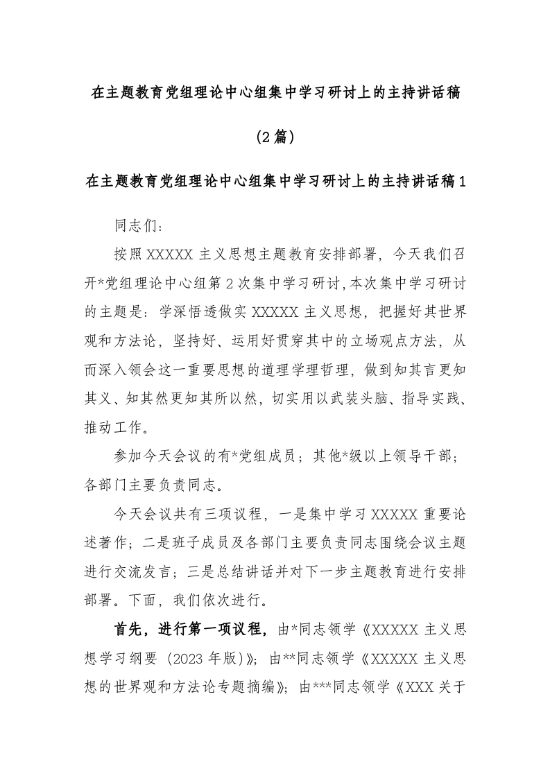 (2篇)在主题教育党组理论中心组集中学习研讨上的主持讲话稿