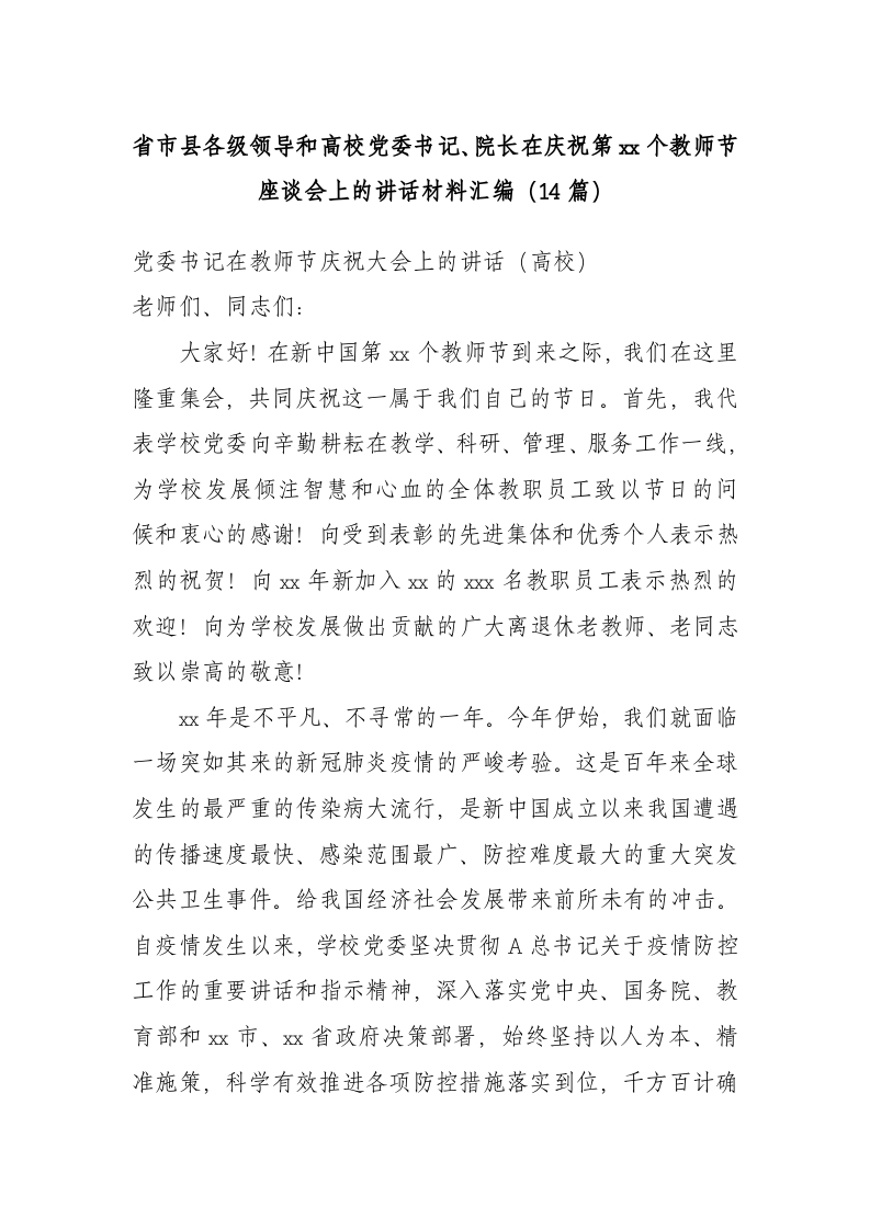 / 14篇省市县各级领导和高校党委书记、院长在庆祝第xx个教师节座谈会上的讲话材料汇编
