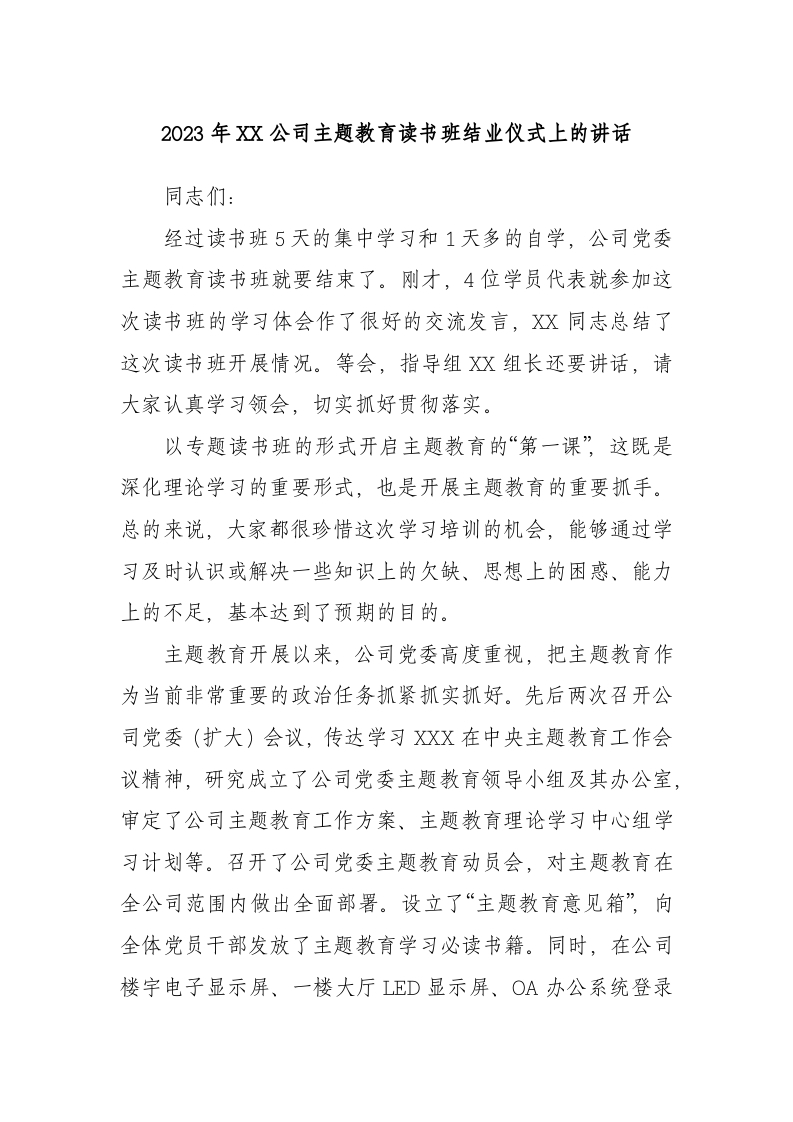 / 2023年公司主题教育读书班结业仪式上的讲话