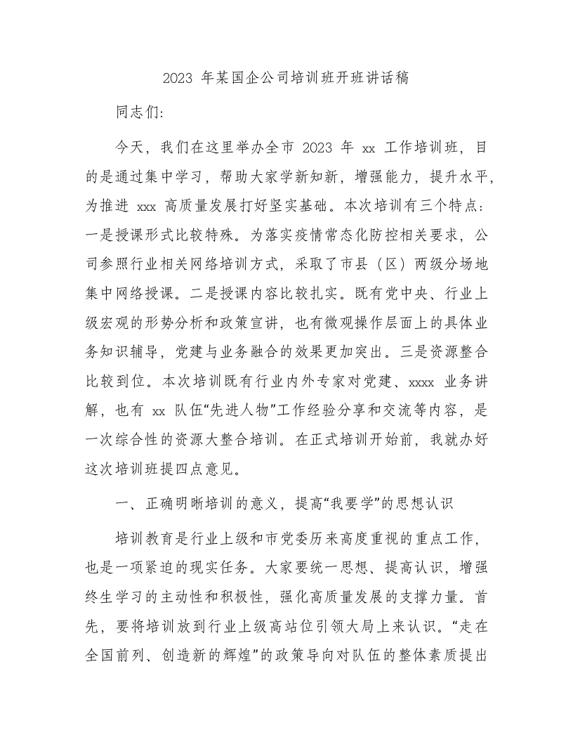 / 2023年国企公司培训班开班讲话稿