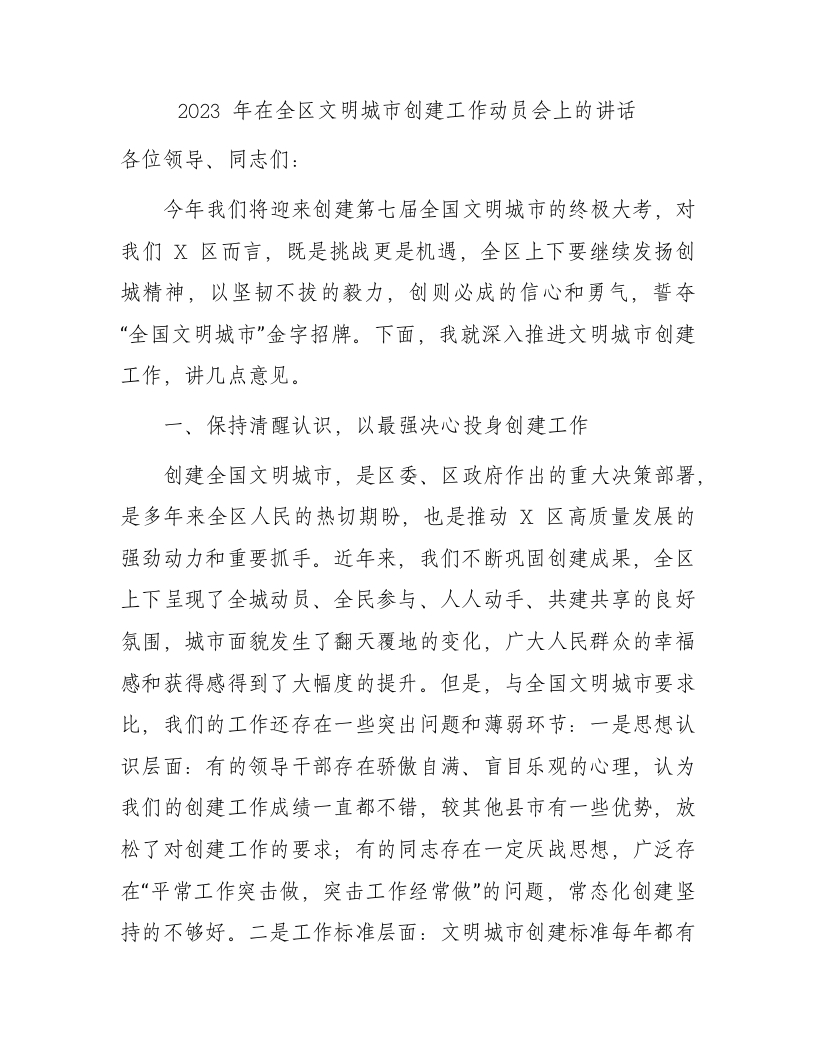 / 2023年在全区文明城市创建工作动员会上的讲话