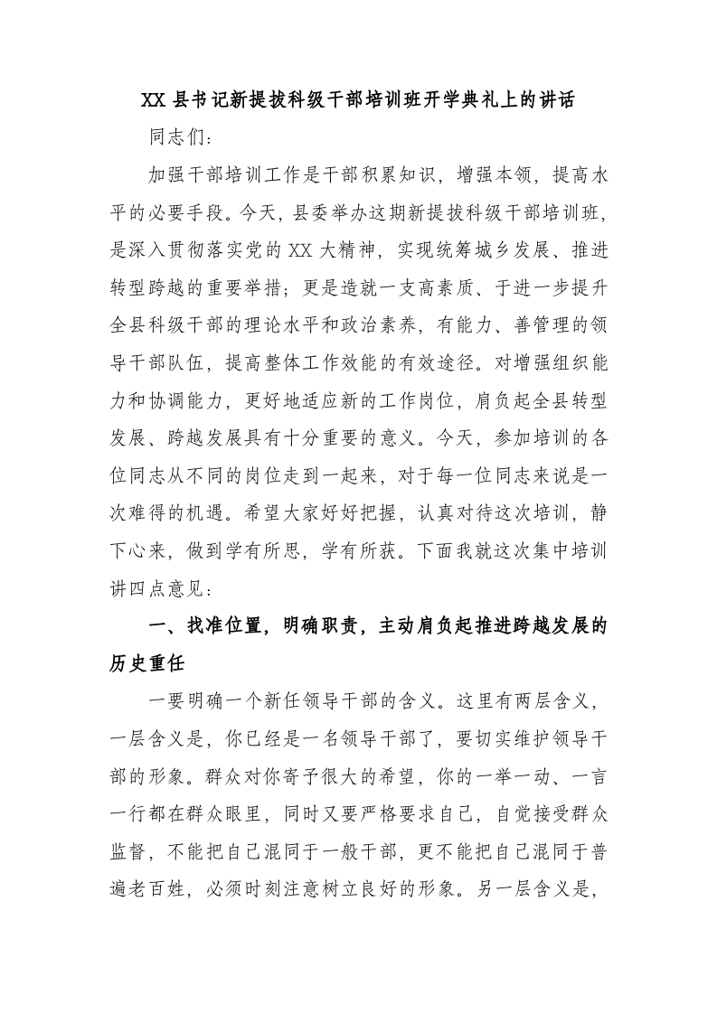 / XX县书记新提拔科级干部培训班开学典礼上的讲话