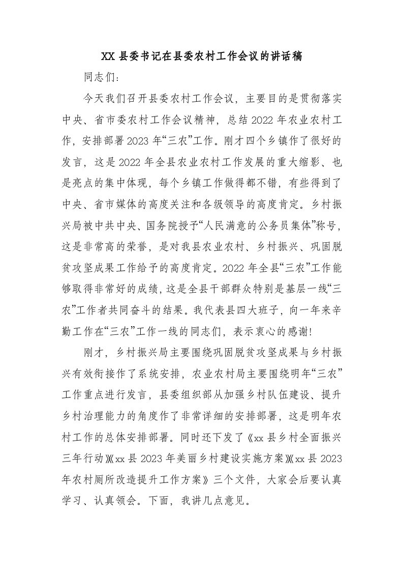 / XX县委书记在县委农村工作会议的讲话稿