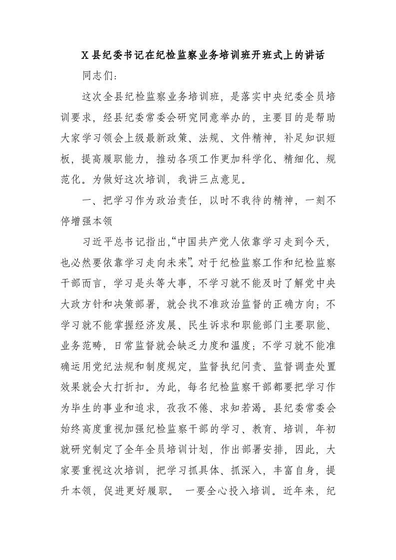 / X县纪委书记在纪检监察业务培训班开班式上的讲话