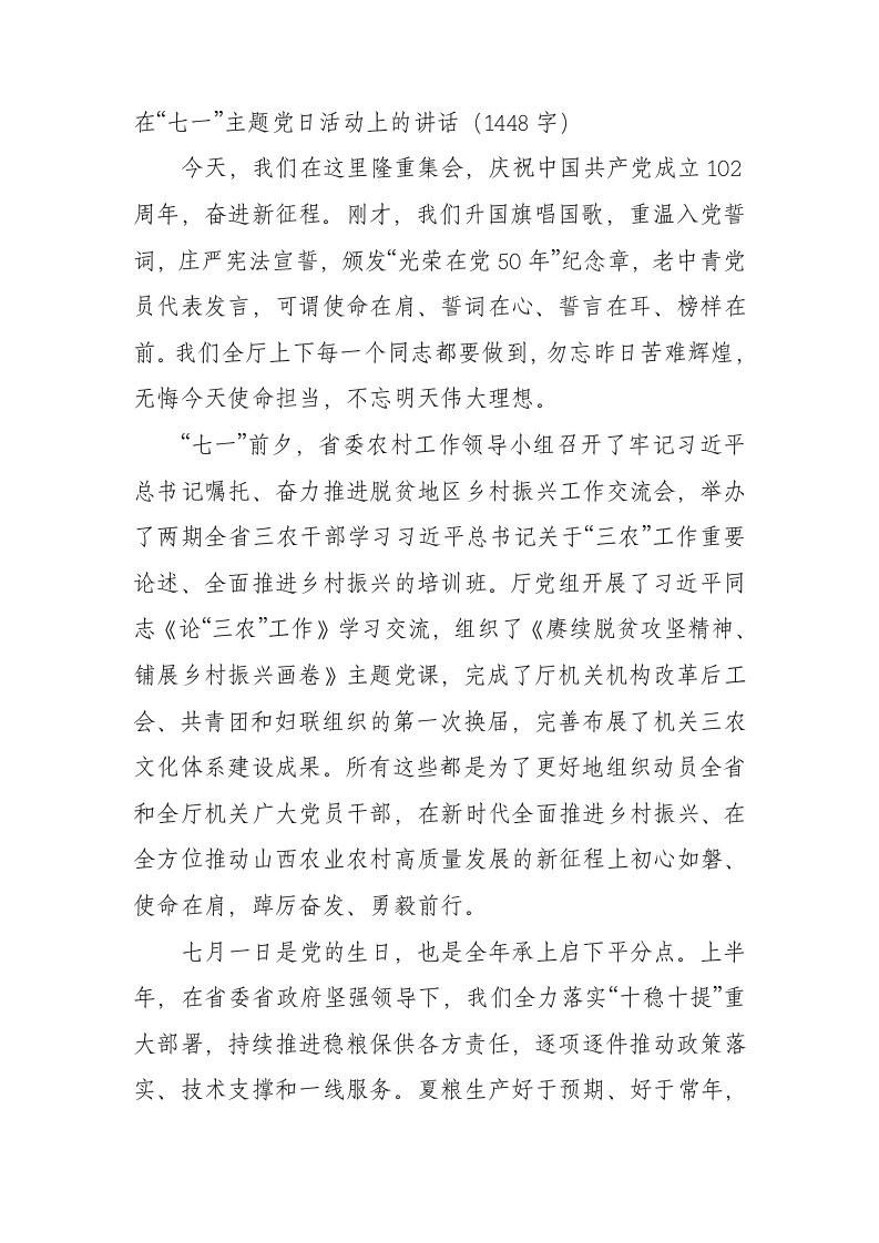 七一主题党日活动上的讲话(农业农村)