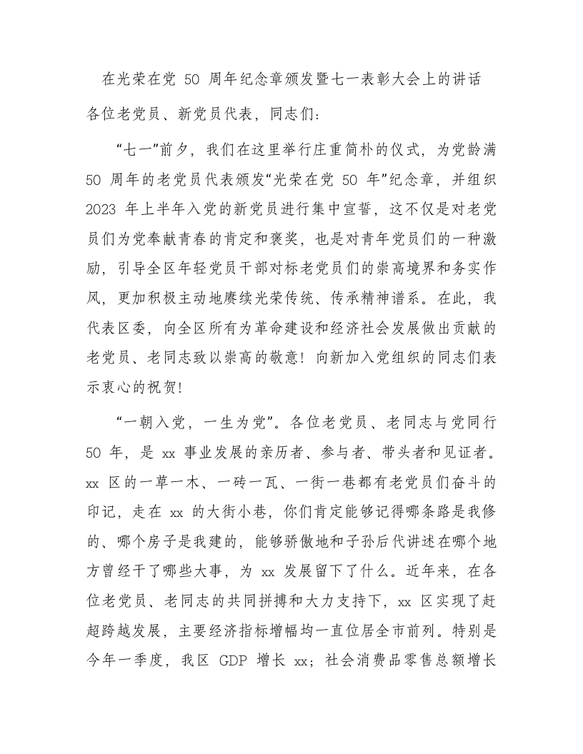 / 七一在光荣在党50周年纪念章颁发暨七一表彰大会上的讲话2500字