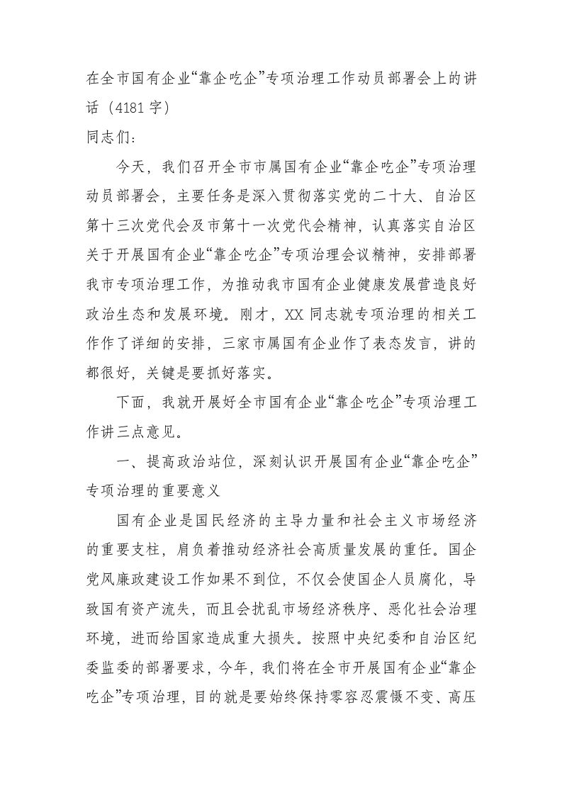 / 在全市国有企业“靠企吃企”专项治理工作动员部署会上的讲话