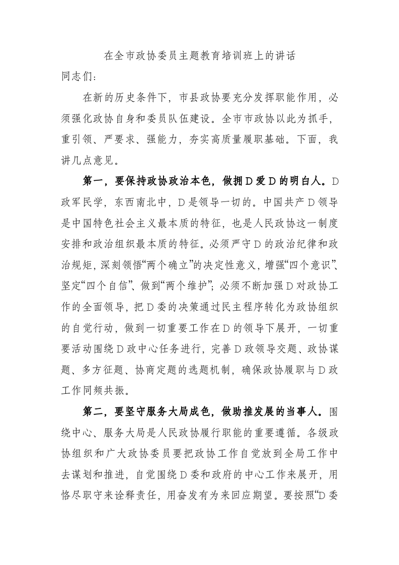 / 在全市政协委员主题教育培训班上的讲话