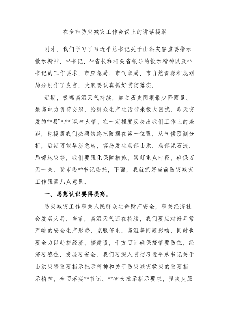 / 在全市防灾减灾工作会议上的讲话提纲