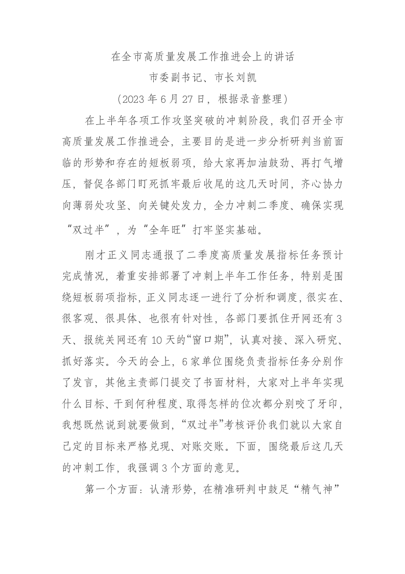 / 在全市高质量发展工作推进会上的讲话