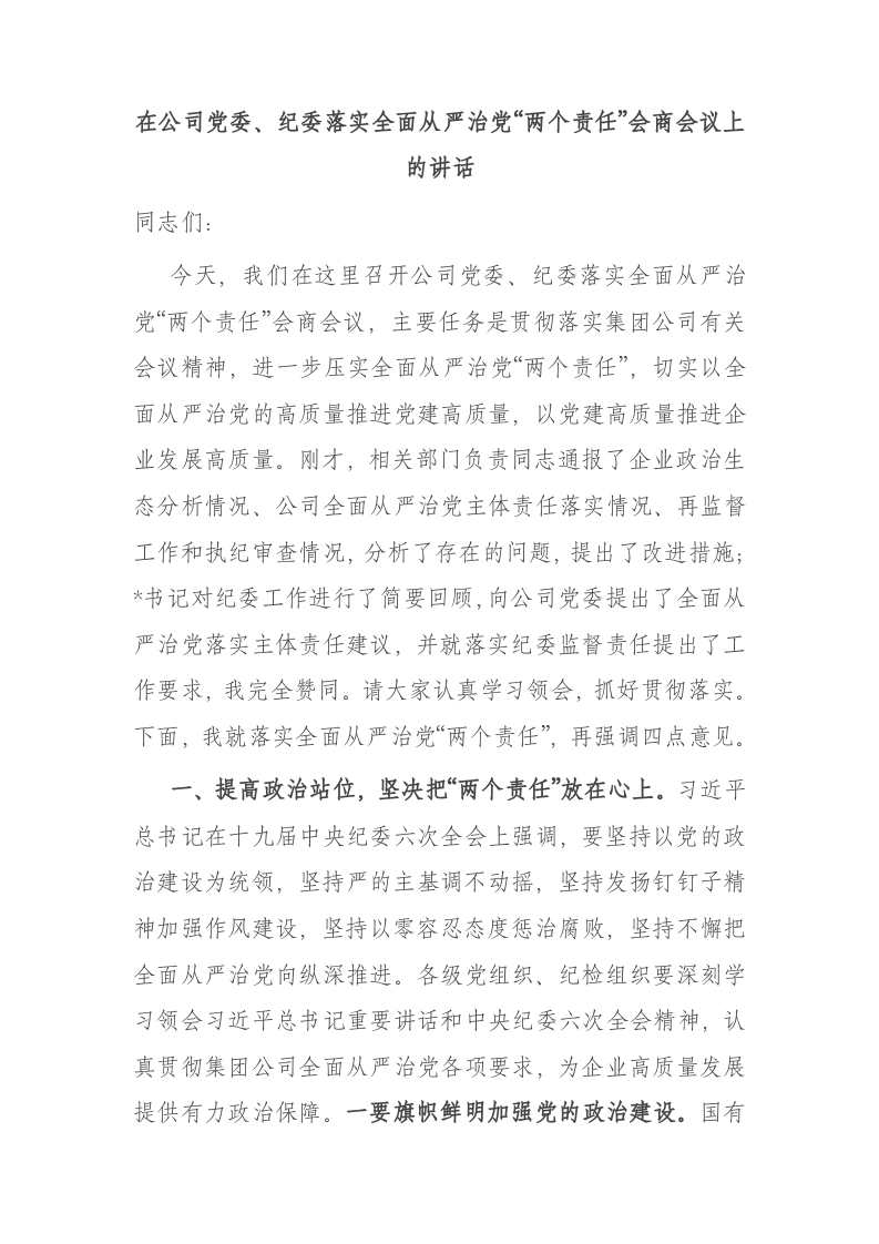 在公司党委、纪委落实全面从严治党“两个责任”会商会议上的讲话