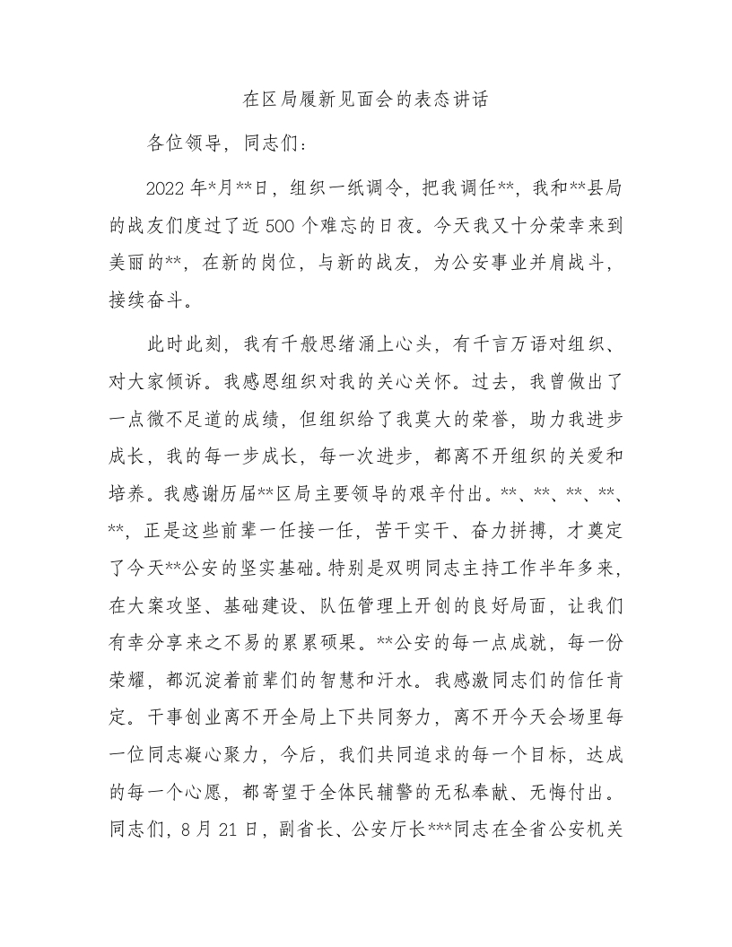 / 在区局履新见面会上的表态讲话