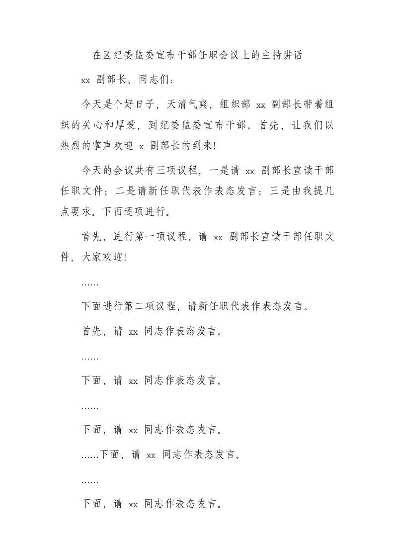 / 在区纪委监委宣布干部任职会议上的主持讲话